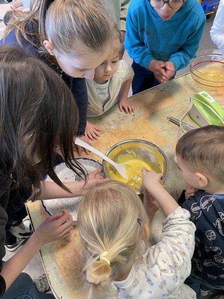 Lundi matin, les élèves de CM de la classe de Sophie et Xavier, sont venus nous rejoindre pour la réalisation de gâteaux au jus d’orange.