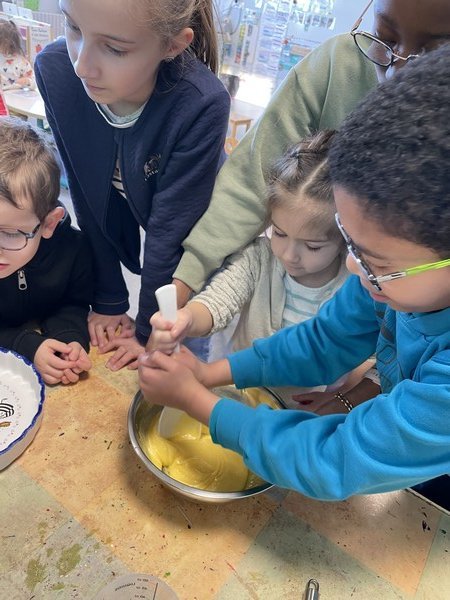 Lundi matin, les élèves de CM de la classe de Sophie et Xavier, sont venus nous rejoindre pour la réalisation de gâteaux au jus d’orange.