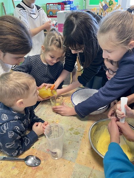 Lundi matin, les élèves de CM de la classe de Sophie et Xavier, sont venus nous rejoindre pour la réalisation de gâteaux au jus d’orange.