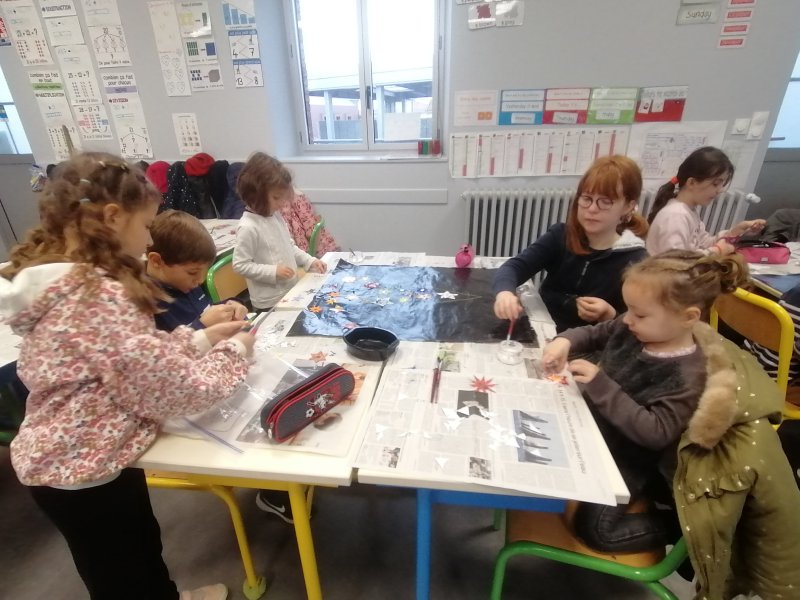 Petits et grands se sont retrouvés avec leur classe “binôme” pour réaliser des décorations de Noël.