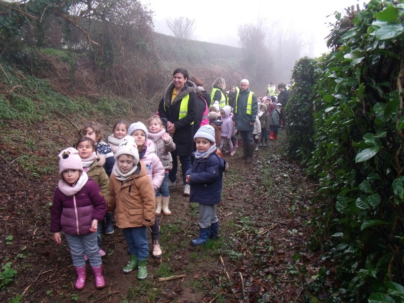 Mardi matin, nous avons randonné autour du bois de la Folie. Une belle balade avec des montées, des descentes, de l’escalade entre les rochers et les racines d’arbre. Le brouillard ne nous a pas empêchés d’apercevoir le château, les moulins, les houx, les moutons et les oies! Autant de découvertes qui ont motivé les petites