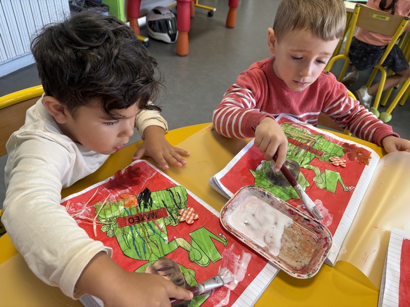 Les enfants se sont appliqués pour réaliser une couverture pour leur cahier de vie : peinture au rouleau ; peinture avec la technique du transfert ; collage pour assembler… Une composition sur le thème de l’année : les élèves de Petite Section sont les petits JARDINIERS.