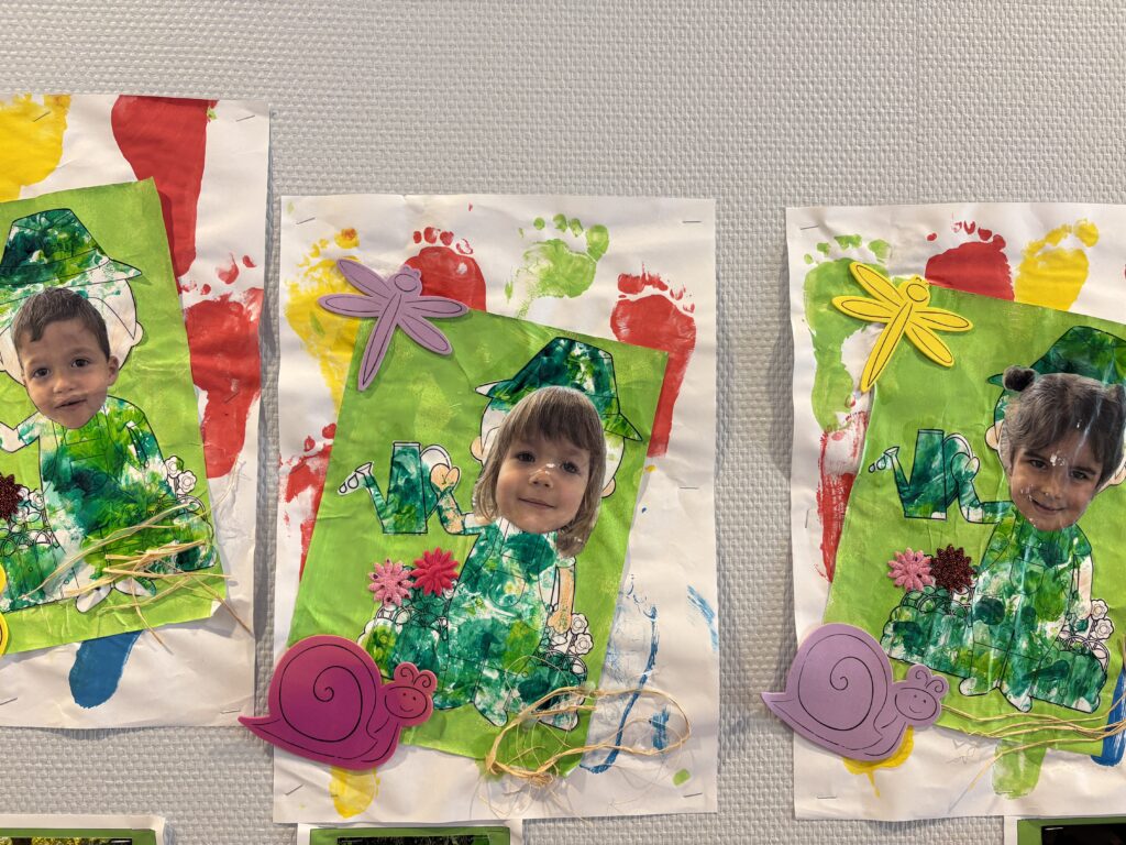 Les enfants ont réalisé des empreintes de pieds… ça “chatouillait” !!! Ils ont ensuite peint un nouveau personnage JARDINIER pour décorer le couloir de leur porte-manteau.
