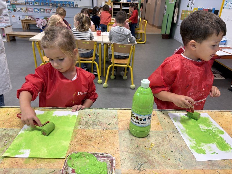 Les enfants se sont appliqués pour réaliser une couverture pour leur cahier de vie : peinture au rouleau ; peinture avec la technique du transfert ; collage pour assembler… Une composition sur le thème de l’année : les élèves de Petite Section sont les petits JARDINIERS.