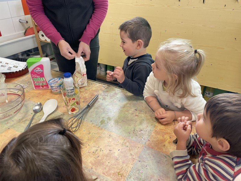 Les enfants ont réalisé un gâteau pour célébrer les anniversaires de Septembre : un Flamusse aux pommes.