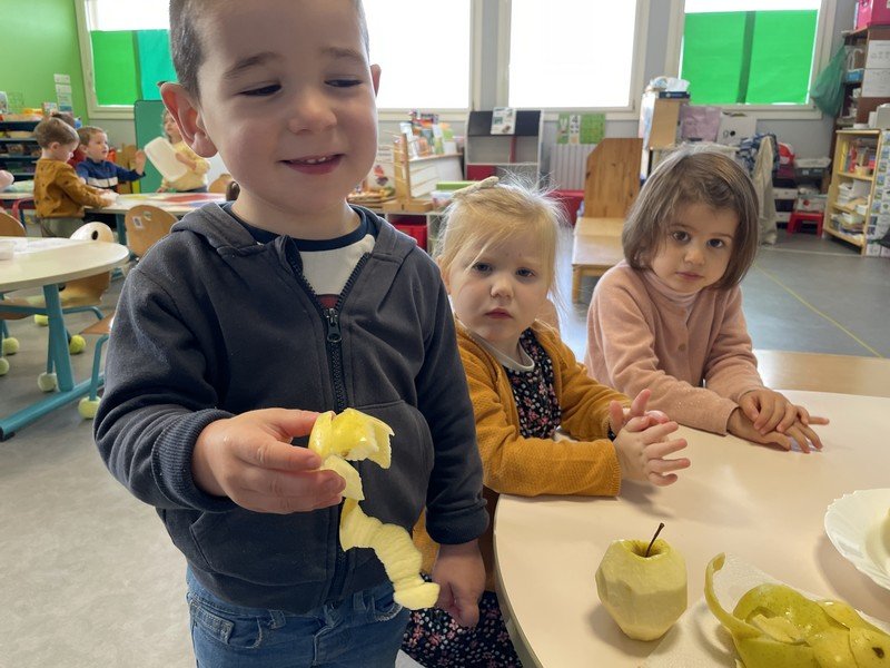 Les enfants ont réalisé un gâteau pour célébrer les anniversaires de Septembre : un Flamusse aux pommes.