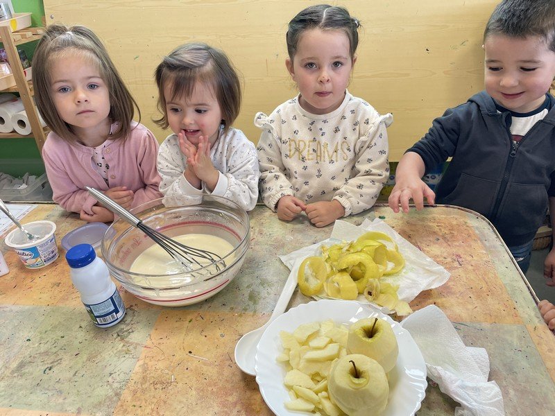 Les enfants ont réalisé un gâteau pour célébrer les anniversaires de Septembre : un Flamusse aux pommes.