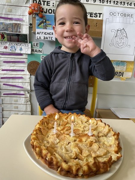 Les enfants ont réalisé un gâteau pour célébrer les anniversaires de Septembre : un Flamusse aux pommes.