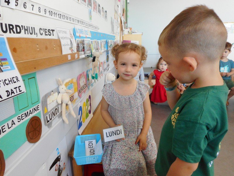 1-Le regroupement du matin pour se dire “Bonjour”, pour “écrire” la date, repérer le tableau des absents et observer la météo.