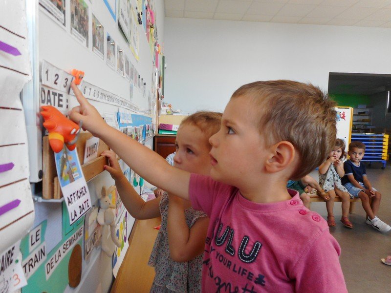 1-Le regroupement du matin pour se dire “Bonjour”, pour “écrire” la date, repérer le tableau des absents et observer la météo.