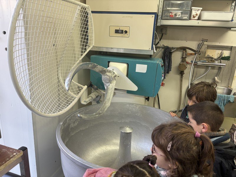 Les enfants ont observé les outils du BOULANGER : le PETRIN OBLIQUE pour préparer de grandes quantités de pâte à pain , le PETRIN pour réaliser de la pâte pour pains spéciaux, la DIVISEUSE pour façonner les pâtons ; la table de préparation.