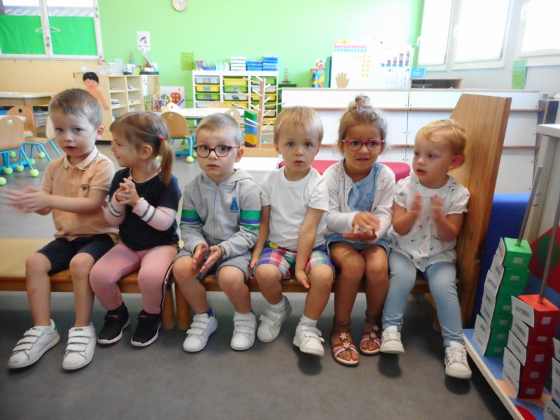 Ils explorent la classe et ils découvrent de nouvelles choses : rencontre avec les mascottes (Monsieur Lapin, Virgule la tortue et Pince-Pince le crabe) ; participation à des ateliers de peinture, de coloriage, de collage ou d’encastrements ; découverte des rituels pour se dire “Bonjour” et pour écrire la date… Les enfants ont chanté et ont frappé dans les mains…