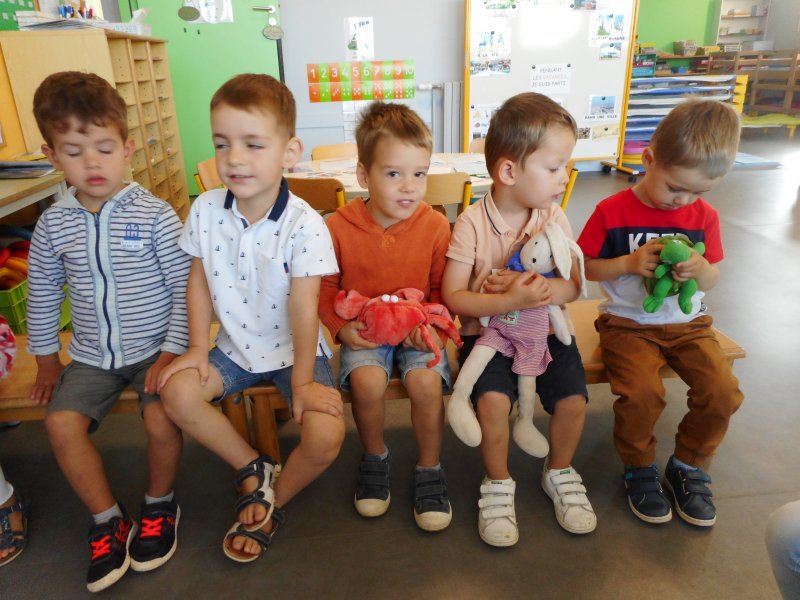 Ils explorent la classe et ils découvrent de nouvelles choses : rencontre avec les mascottes (Monsieur Lapin, Virgule la tortue et Pince-Pince le crabe) ; participation à des ateliers de peinture, de coloriage, de collage ou d’encastrements ; découverte des rituels pour se dire “Bonjour” et pour écrire la date… Les enfants ont chanté et ont frappé dans les mains…