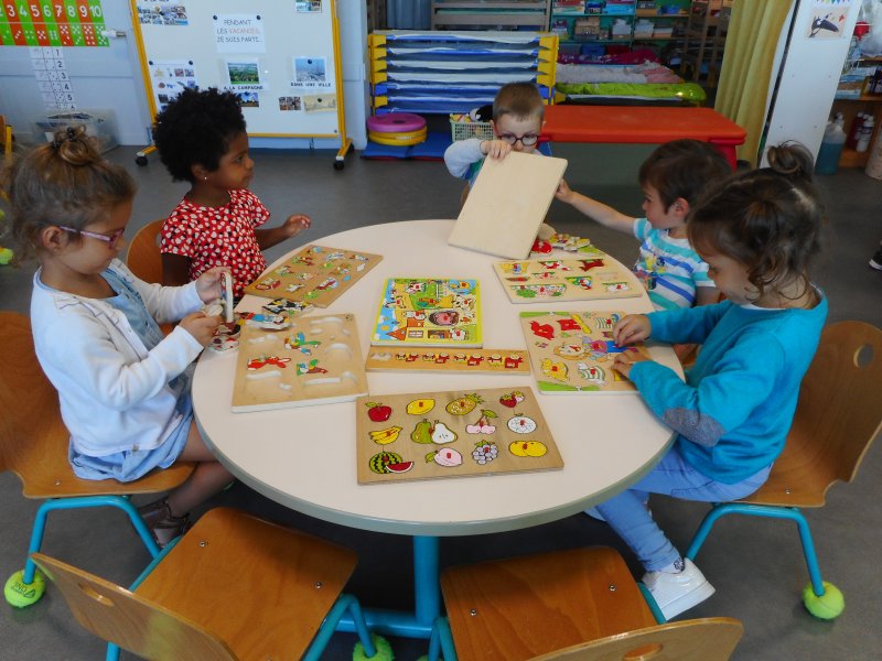 Ils explorent la classe et ils découvrent de nouvelles choses : rencontre avec les mascottes (Monsieur Lapin, Virgule la tortue et Pince-Pince le crabe) ; participation à des ateliers de peinture, de coloriage, de collage ou d’encastrements ; découverte des rituels pour se dire “Bonjour” et pour écrire la date… Les enfants ont chanté et ont frappé dans les mains…