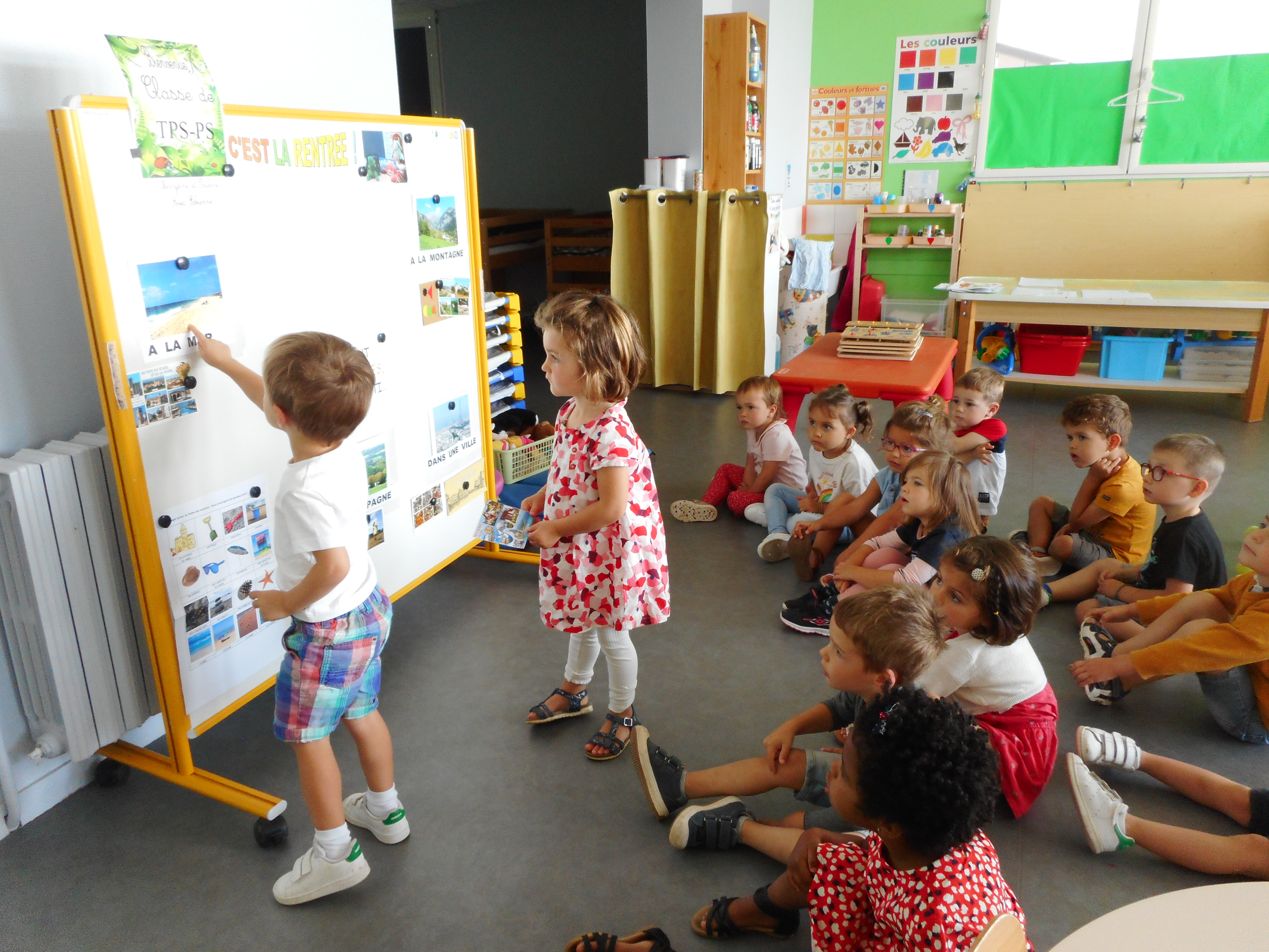 Ils explorent la classe et ils découvrent de nouvelles choses : rencontre avec les mascottes (Monsieur Lapin, Virgule la tortue et Pince-Pince le crabe) ; participation à des ateliers de peinture, de coloriage, de collage ou d’encastrements ; découverte des rituels pour se dire “Bonjour” et pour écrire la date… Les enfants ont chanté et ont frappé dans les mains…