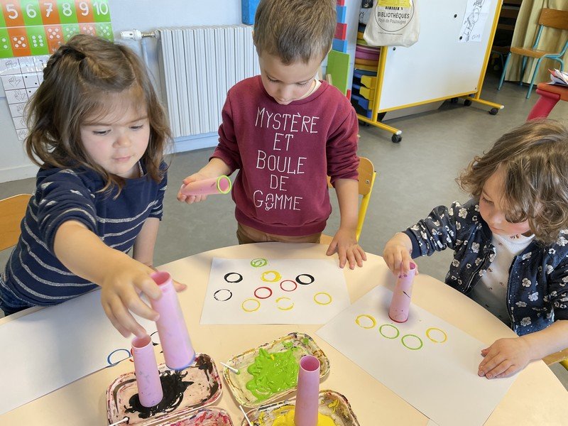 Des cercles pour symboliser les couleurs des anneaux olympiques ; des empreintes de mains pour représenter des poussins ; un cadre de carrés peints avec l’aide d’une spatule… Les enfants se sont appliqués pour vous souhaiter de