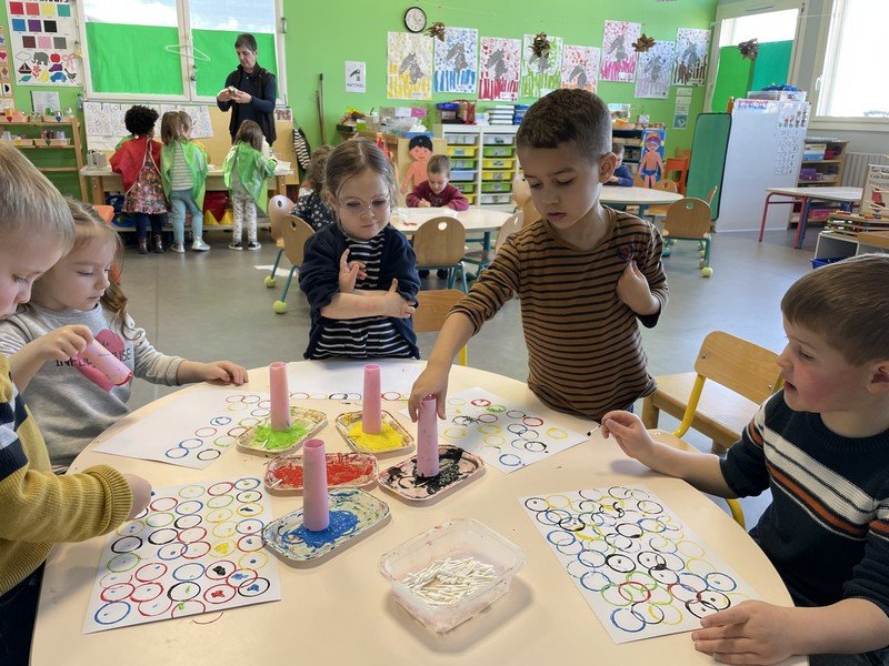 Des cercles pour symboliser les couleurs des anneaux olympiques ; des empreintes de mains pour représenter des poussins ; un cadre de carrés peints avec l’aide d’une spatule… Les enfants se sont appliqués pour vous souhaiter de