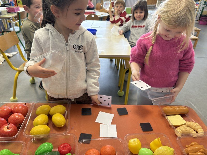Après notre découverte du marché de Pouzauges, les enfants ont « joué » à la marchande pour approfondir la construction des quantités et du nombre, et apprendre à dénombrer.