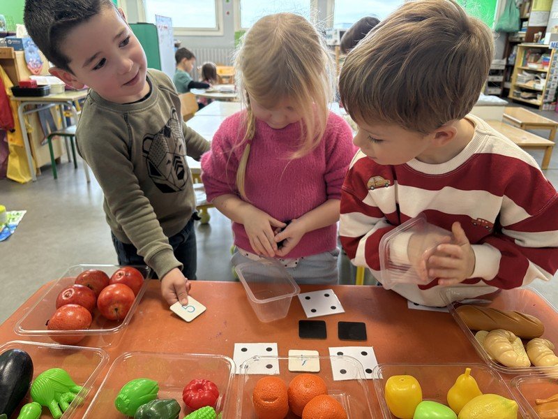 Après notre découverte du marché de Pouzauges, les enfants ont « joué » à la marchande pour approfondir la construction des quantités et du nombre, et apprendre à dénombrer.