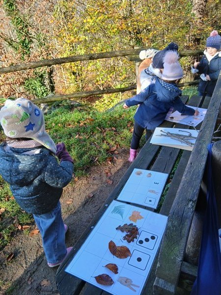 Nous avons pu remarquer les feuilles, les châtaignes et les bogues, des pommes de pin, des fougères, des glands et des bouts de bois pour réaliser des compositions en Land’Art ou compléter des tableaux pour dénombrer.