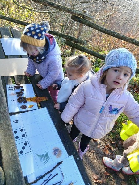Nous avons pu remarquer les feuilles, les châtaignes et les bogues, des pommes de pin, des fougères, des glands et des bouts de bois pour réaliser des compositions en Land’Art ou compléter des tableaux pour dénombrer.