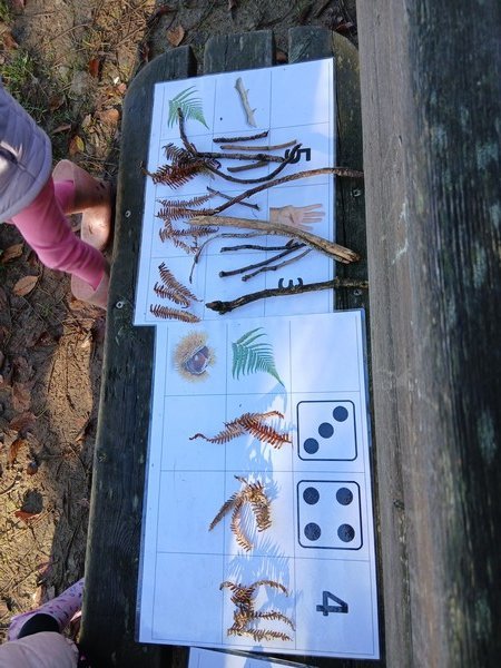 Nous avons pu remarquer les feuilles, les châtaignes et les bogues, des pommes de pin, des fougères, des glands et des bouts de bois pour réaliser des compositions en Land’Art ou compléter des tableaux pour dénombrer.