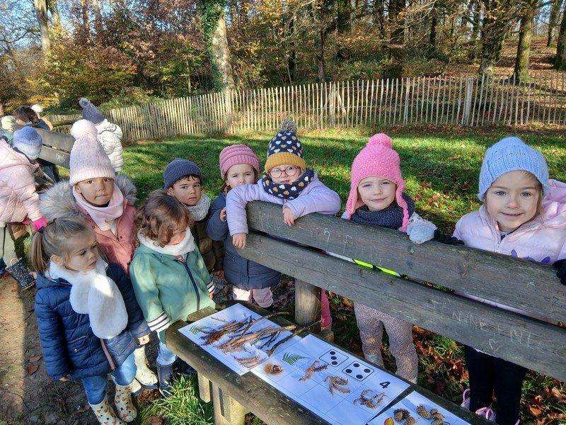 Nous avons pu remarquer les feuilles, les châtaignes et les bogues, des pommes de pin, des fougères, des glands et des bouts de bois pour réaliser des compositions en Land’Art ou compléter des tableaux pour dénombrer.
