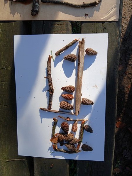 Nous avons pu remarquer les feuilles, les châtaignes et les bogues, des pommes de pin, des fougères, des glands et des bouts de bois pour réaliser des compositions en Land’Art ou compléter des tableaux pour dénombrer.