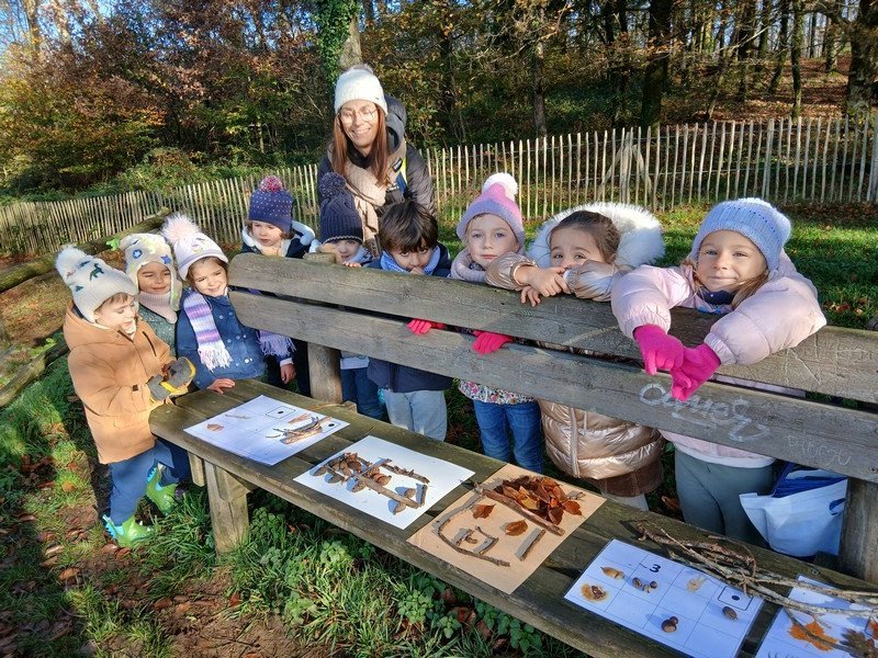 Nous avons pu remarquer les feuilles, les châtaignes et les bogues, des pommes de pin, des fougères, des glands et des bouts de bois pour réaliser des compositions en Land’Art ou compléter des tableaux pour dénombrer.