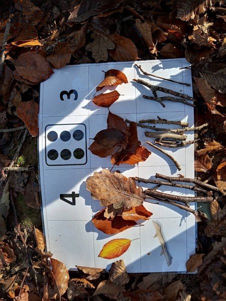 Nous avons pu remarquer les feuilles, les châtaignes et les bogues, des pommes de pin, des fougères, des glands et des bouts de bois pour réaliser des compositions en Land’Art ou compléter des tableaux pour dénombrer.