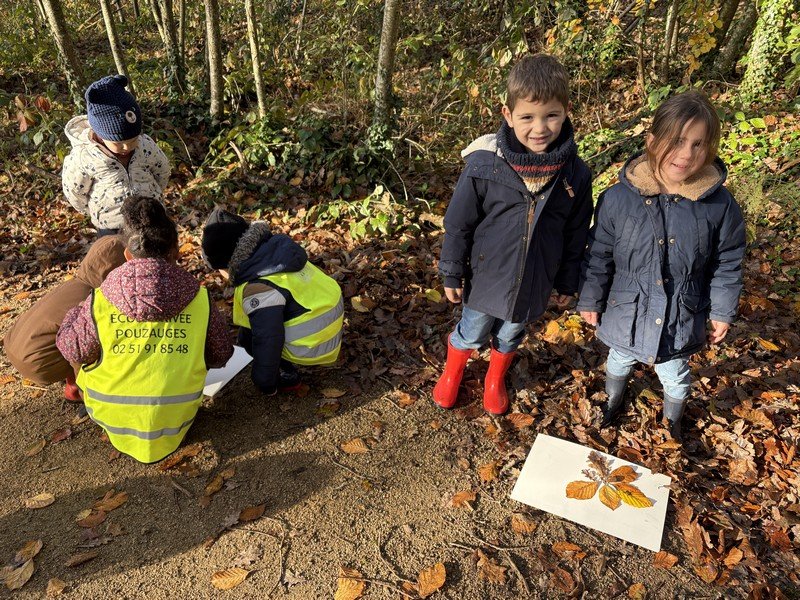 Nous avons pu remarquer les feuilles, les châtaignes et les bogues, des pommes de pin, des fougères, des glands et des bouts de bois pour réaliser des compositions en Land’Art ou compléter des tableaux pour dénombrer.