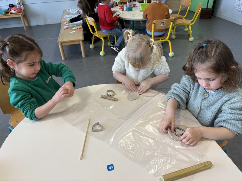 Pour célébrer les fêtes de Pâques, les enfants ont composé une suspension décorative, réalisée en modelant de la pâte Plastiroc avec l’aide de pochoirs. Les enfants se sont entraînés pour enfiler le fil et attacher les éléments. Joyeuses fêtes de Pâques