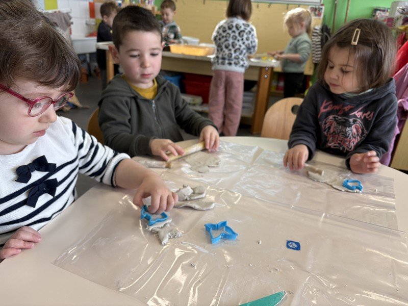 Pour célébrer les fêtes de Pâques, les enfants ont composé une suspension décorative, réalisée en modelant de la pâte Plastiroc avec l’aide de pochoirs. Les enfants se sont entraînés pour enfiler le fil et attacher les éléments. Joyeuses fêtes de Pâques
