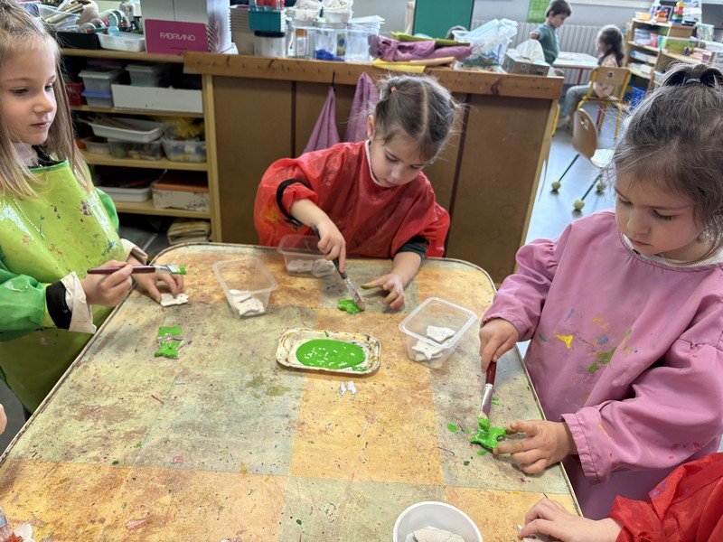 Pour célébrer les fêtes de Pâques, les enfants ont composé une suspension décorative, réalisée en modelant de la pâte Plastiroc avec l’aide de pochoirs. Les enfants se sont entraînés pour enfiler le fil et attacher les éléments. Joyeuses fêtes de Pâques