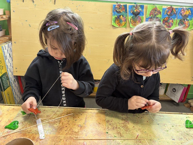 Pour célébrer les fêtes de Pâques, les enfants ont composé une suspension décorative, réalisée en modelant de la pâte Plastiroc avec l’aide de pochoirs. Les enfants se sont entraînés pour enfiler le fil et attacher les éléments. Joyeuses fêtes de Pâques