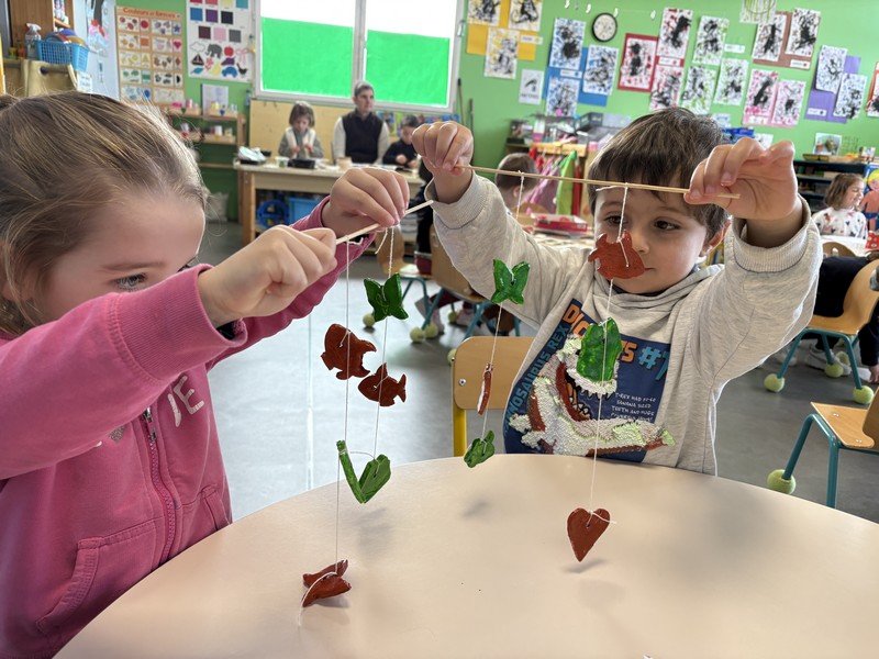 Pour célébrer les fêtes de Pâques, les enfants ont composé une suspension décorative, réalisée en modelant de la pâte Plastiroc avec l’aide de pochoirs. Les enfants se sont entraînés pour enfiler le fil et attacher les éléments. Joyeuses fêtes de Pâques