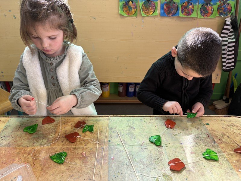 Pour célébrer les fêtes de Pâques, les enfants ont composé une suspension décorative, réalisée en modelant de la pâte Plastiroc avec l’aide de pochoirs. Les enfants se sont entraînés pour enfiler le fil et attacher les éléments. Joyeuses fêtes de Pâques